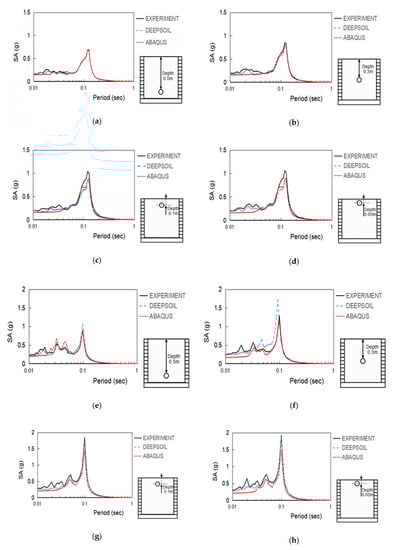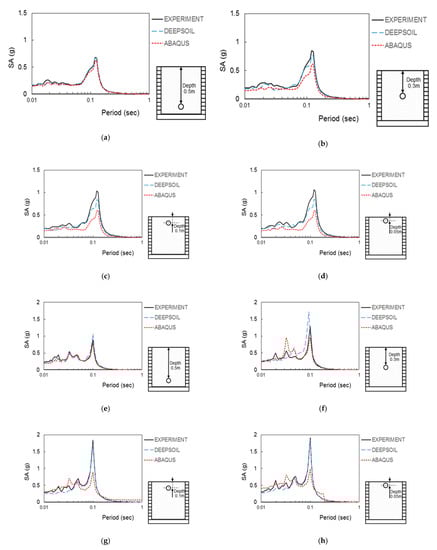 Figure 7a–d present the spectral acceleration graphs of the experiment and numerical analysis for sine 8 Hz. As the depth becomes smaller from 0.5 m to 0.05 m, the greater the difference occurs between the experiment and the numerical analysis. As the depth becomes smaller, the spectral acceleration of numerical analysis is smaller than that of experiment. Figure 7e–h display the spectral acceleration graphs of the experiment and numerical analysis for sine 10 Hz. Near the bottom of the model, DEEPSOIL amplifies slightly higher than the 1 g shaking table test, and the amplification of ABAQUS is low. In Spectral acceleration at a depth of 0.3 m below the surface, DEEPSOIL predicted the very similar SA with the 1 g shaking table test and ABAQUS amplified somewhat lower. Overall, the amplification of ABAQUS is low, so the gap of spectral acceleration between the shaking table test and analysis increases from bottom to surface. The analysis of DEEPSOIL is very similar with the spectral acceleration graph of the shaking table test at all depths.