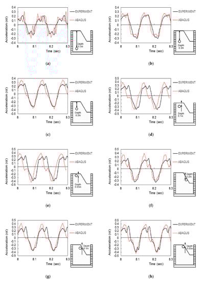 Part of acceleration-time history graph for experiment and analysis in flat ground: (a–d) Sine 8 Hz at depth 0.5 m, 0.3 m, 0.1 m, 0.05 m; (e–h) Sine 10 Hz at depth 0.5 m, 0.3 m, 0.1 m, 0.05 m.