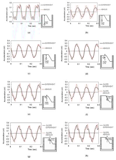 Figure 10a–e are the acceleration-time history at the center of the slope model for sine 8 Hz. As the depth decreases, the acceleration peaks between the experiment and ABAQUS gradually increase, and the difference gradually increases, but the trend is still very close. Figure 10f–h are the slope acceleration time history of the slope model for sine 8 Hz. As the depth decreases, the acceleration peaks of the test and ABAQUS gradually increase, and the acceleration time history is very close.