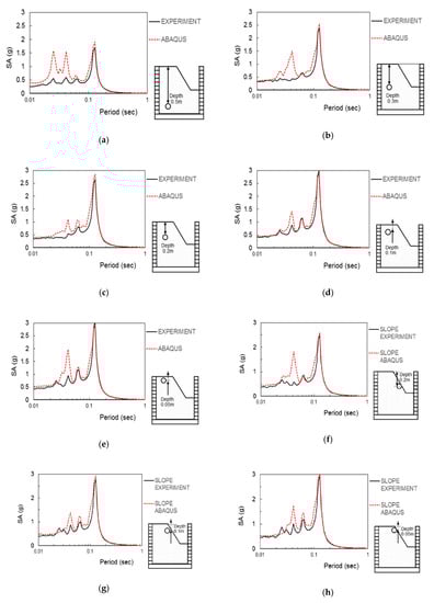 The behavior characteristics of the model test method were compared with the numerical simulation method. Experiments and analysis values were compared and evaluated using acceleration-time history and spectral acceleration (SA). The experimental values were obtained from accelerometers installed at different depths in the center (or slope) of the laminar shear box of the 1 g shaking table test. The analysis value of DEEPSOIL was obtained at the same depth as the accelerometer buried in the 1 g shaking table test after modeling the semi-infinite ground having the property values of the experiment and performing 1D analysis. In ABAQUS, the ground model used in the shaking table test was modeled in the actual size and the boundary condition was set as the infinite boundary. Then, the analysis value in ABAQUS was obtained at the same location as the location where the accelerometer was buried in the 1 g shaking table test. The response spectrum plots the maximum response to seismic motions with different frequency components, and when the response variable is acceleration, it is called an acceleration response spectrum or spectral acceleration. Spectral acceleration is represented as the maximum response acceleration for a dynamic load with the vibration system of various periods. Using this characteristic, it is possible to confirm the amplification occurring in a frequency period other than the dynamic load used in the experiment. Therefore, using the response spectral acceleration, it is possible to confirm amplification characteristics that are not visible with the sine 8 and10 Hz wave used in this experiment.