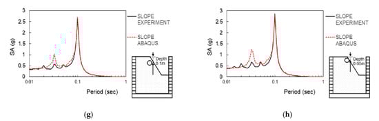 Figure 12a–e present the spectral acceleration of the slope model for sine 8 Hz. As the depth decreases, the trend and peak value of the spectrum acceleration between the experiment and ABAQUS are fairly close. For the left side of the peak, the numerical value of ABAQUS is greater than the experimental value. Figure 12f–h display the slope model spectral acceleration for sine 8 Hz, the general trend and peak value of the experiment and ABAQUS are very close. As the depth decreases, the spectral acceleration value on the left gradually becomes consistent.