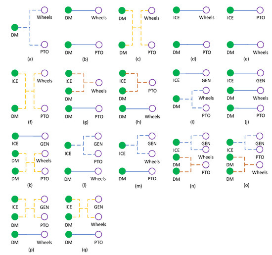 Figure 1 shows the topologies for seventeen types of powertrains based on the power flow. In Figure 1, a–c is the powertrain topologies of the battery-electric powertrain topologies, d–h are parallel hybrid powertrain topologies, i–k are series hybrid powertrain topologies, and l–q are series–parallel hybrid powertrain topologies. ICE represents an internal combustion engine, GEN represents a generator, DM represents a drive motor, Wheels refers to the two rear drive wheels, and PTO represents a power takeoff shaft.