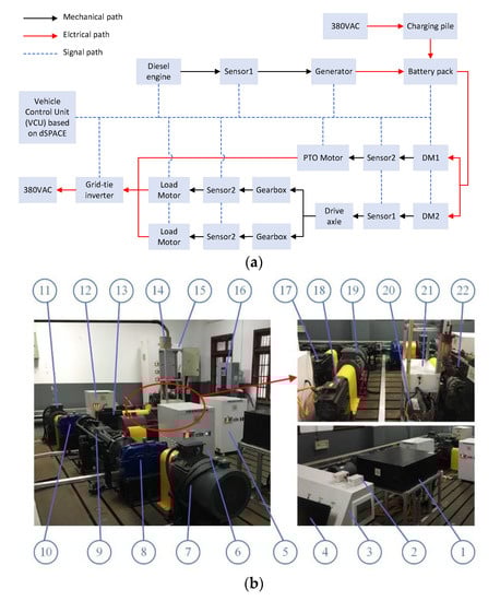 Figure 5. The test platform for a series hybrid electric tractor with a dual-motor-independent-driven powertrain: (a) structural scheme of the series hybrid electric tractor of the test platform; (b) photographs of the reconfiguration test platform. (1) battery pack; (2) communication converter; (3) operating console; (4) laptop; (5) control system of the drive motor 1; (6) control system of the drive motor 2; (7) right load motor; (8) right raising speed gearbox; (9) drive axle; (10) left raising speed gearbox; (11) left load motor; (12) generator control system; (13) generator; (14) exhaust pipe; (15) grid-connected inverter; (16) charging pile; (17) drive motor 2; (18) drive motor 1; (19) PTO motor; (20) lead–acid battery; (21) engine controller; (22) diesel engine. Note: torque-speed sensors are inside of the yellow covers.