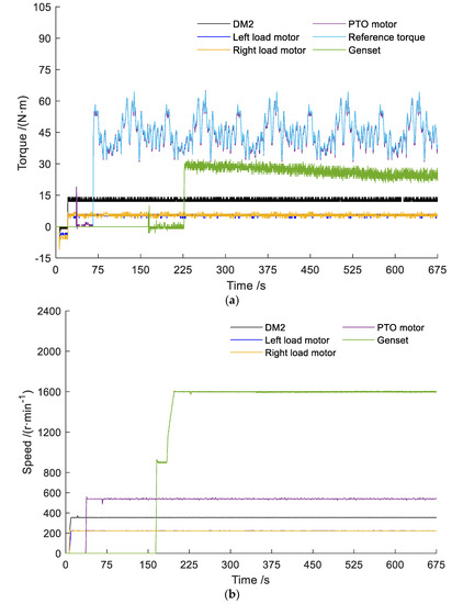 As shown in Figure 9b, the speed response time of the DM2 was faster than that of the two LMs. The same phenomenon occurred in the DM1 and the PTO motor due to the motor characteristics of PMSMs and AMs. However, the speed response time between the two LMs was not the same. Specifically, the response speed of the right load motor was less than that of the left load motor. This was caused by the different frictional resistance of the mechanical connection between the left and right load motors via the drive axle differential. Moreover, the engine speed increased from idle speed to the set value of 1600 r/min, and the speed fluctuation range of the genset was 1590 to 1606 r/min. Further, the maximum relative error compared to the set value was approximately 0.625%. The speed fluctuation of motor 2 was 354~355 r/min, and the maximum relative error with a theoretical value of 353.6 r/min was approximately 0.396%. The left load motor speed fluctuation was 223~227 r/min, and for the right motor, the fluctuation was 222~225 r/min. The maximum relative errors with a theoretical value of 353.6 r/min were approximately 0.889% and 1.333%. The PTO motor was run using variable torque, which made the speed fluctuation larger. The speed fluctuation range was 529~550 r/min, and the maximum relative error from the set value of 550 r/min was approximately 2.037%. All these values are within the allowable range of error for the measurement and control system.