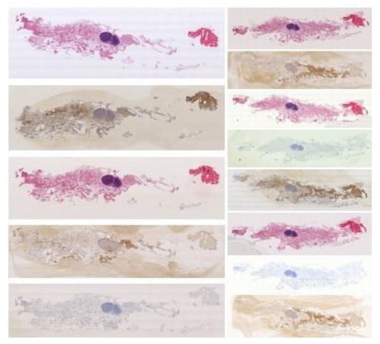 Various approaches have been proposed for 2D non-rigid registration of histology slides of the same anatomical site, such as B-splines and common information extraction [3], or multiresolution supervised registration [4], on the basis of the elastix toolbox [5]. Both these examples [3,4] have reported relatively accurate results in a decent amount of time, but none of them were fully automatic and their evaluation datasets were very small, i.e., 8 pairs of lung histology slides with few different stains [3] and 10 histology slide pairs stained with hematoxylin and eosin (H&E) and anti-PD-L1 antibody (CD274) [4]. Borovec et al. [6] used a comparatively larger multi-stain 2D histologic dataset (Figure 1) to evaluate 11 image registration methods, including intensity-based (elastix [5], ANTs [7,8], NiftyReg [9], bUnwarp [10], Multistep [11], DeepHistReg [12]), integral projection-based [13], homography-based [14], feature-based (OpenCV [15], TrakEM2 [16]), hybrid of feature and intensity-based (DROP [17], feature-based + Elastix [18], register virtual stack slices [10]), as well as segmentation-based (ASSAR [19], SegReg [20]) approaches. Some of these approaches were developed during the automatic non rigid histological image registration (ANHIR) challenge and some were developed after the challenge concluded. According to that evaluation study [6], the method with the optimal accuracy and robustness for elastic registration was ANTs [7,8], but at the cost of a very long runtime. An unsupervised registration approach for H&E slides has also been developed on the basis of deep learning features [21,22,23,24], reporting relatively good performance with very low runtime. Although such approaches could be applied for computer-assisted interventions [25], they are limited by their need for very large datasets to be efficiently trained and their requirement for specialized hardware (i.e., a general-purpose graphical processing unit (GPGPU)) to achieve low runtime.