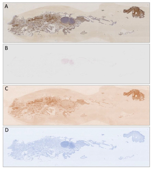 Example results of the applied color deconvolution in a diaminobenzidine (DAB)-stained slide, illustrated in (A) color deconvolution artificially reproducing and separating the contributions of (B) FastRed, (C) DAB, and (D) FastBlue stains.