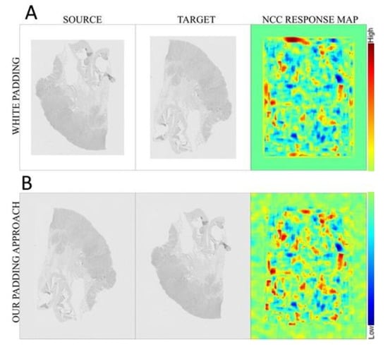 Furthermore, noting that the provided pairs of images were of varying sizes, we padded each image to ensure that (i) the size of paired images were the same (this step is not mandatory but simplifies the application of the transformation on landmarks) and (ii) the target tissue was in the image center. Once all image pairs were padded such that they were of the same size, we further padded them (4× the size of the similarity metric’s kernel, Equation (1)) to ensure that the apparent tissue was far enough from the image boundaries, and hence accommodated appropriate calculation of the deformation field after changes caused by the affine registration step. A binary mask, computed by excluding the padded portions of the image (size of the similarity metric kernel, Equation (1)) was also used during the affine registration process.