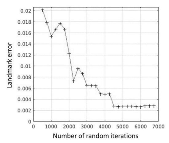 where is the initial rigid transformation between the images. The initial transformation was obtained using a brute force search, where 4500 pairs of rigid transformations (which captured all possibly combinations of random rotations and translations for the specific dataset) were applied to the moving image and the combination, and the best NCC metric value was saved as . Specifically, a standard deviation of 180° for the angle (ensuring all rotations are sampled) and the standard deviation of the random displacement in each coordinate was equal to 10% of the input image width used, which was large enough to showcase deformation but at the same time small enough to mitigate folding in the dataset due to extreme deformations. Figure 6 illustrates the error in the landmarks as a function of the number of random iterations for the given dataset. This brute force search, performed at the highest pyramid level and not requiring computation of metric gradients, had significant impact on robustness and was relatively fast, i.e., contributing only a few seconds to the total registration time. Figure 7 illustrates an example result from the application of these steps before the actual affine registration.