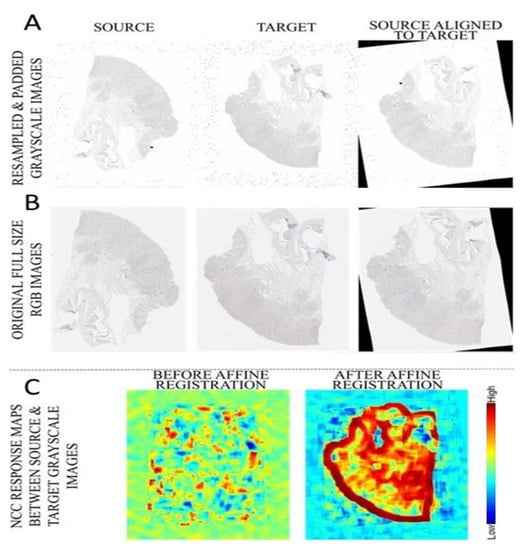 Example results of our affine registration step. (A) The affine registration estimated and applied on the resampled and padded images; (B) application of the registration applied to the original full-scale images; (C) the NCC response map between source and target before and after affine registration.