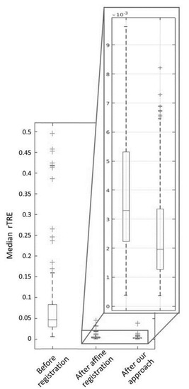 rTRE represents the geometric accuracy between the target and warped landmarks in the target image frame. The motivation for using the median is to avoid penalization of few inaccurate landmarks, especially when the others are well-registered. Since only the challenge organizers had access to the testing dataset of the challenge for obvious reasons, in this study, results based on the rTRE achieved in the public data of the ANHIR challenge are reported. Specifically, TRE is defined as