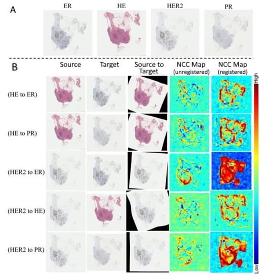 (A) Four example consecutive differently stained images from a breast tissue case. Different stains include hematoxylin and eosin (H&E), estrogen receptor (ESR), progesterone receptor (PGR), and human epidermal growth factor receptor 2 (ERBB2). (B) Example registration results of the source image, registered to the target, resulting in the aligned source. The NCC response maps before and after registration are illustrated in the two right columns.