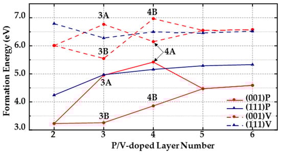 The substitutional location of the P atom and V are shown in Figure 1. These positions are found based on the structural symmetry of the (001) and (111) surface structures. For example, the five outermost atoms in the third C layer of the (001) surface shown in Figure 1a are defined as C31, C32, C33, C34, and C35, respectively. C31, C33, and C35 as well as C32 and C34 are symmetrical, but C31/33/35 and C32/34 are asymmetrical, so the third layer of the (001) surface structure has two doping sites (C31/33/35 and C32/34) with different properties. We define these two sites as 3A and 3B, in which the number represents the doping layer and the capital letter (A and B) refers to the two different doping sites in this layer. Similarly, the doping sites in other layers are defined as 2A, 4A, 4B, 5A, and 6A, respectively. The formation energies of a single P atom and a single V on the (001) and (111) surfaces are shown in Figure 2.
