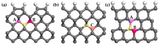 Since the hydrogen atom is small, it is present in the crystal gap (interstitial atom) around the vicinity of the PV complex and has many possible locations. Based on previous research on P–H complexes in surface structures [17] and bulk diamonds [31], there are four H different sites around PV complex: anti-bond (AB), bond-center (BC), cross-line (CL), and on-vacancy (OV) sites, as shown in Figure 5. The AB site is on the opposite extension of the P–C bond, the BC site is inserted between the C and P atoms, the CL site is near the two planes’ intersecting line (one plane consists of C1, C3, and P and the other consists of C2, C4, and P), and the OV site is on the vacancy location.