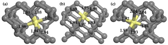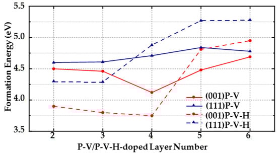 Figure 6 shows the lowest formation energy of PV and PVH complex in each layer of (001) and (111) surface. The lowest formation energies of the PV and PVH complex on the two surfaces show the same trends of increase and decrease. As shown in Figure 6, the lowest formation energies of the PV and PVH complex in each layer of the (111) surface are all higher than those of the (001) surface, which means that the PV and PVH complexes more easily form on the (001) surface, and that is the same for the PH complex [17]. Therefore, the (001) surface contains more P-related complexes than the (111) surface, which may be one of the reasons why the compensation ratios of the (001) surface are approximately one order of magnitude higher than those of the (111) surface [18]. In both (001) and (111) diamonds, the formation energies of the PVH complex in the second and third layer are lower than those of the PV complex, but in the fifth and sixth layer, the formation energies of the PVH complex are same as or higher than those of the PV complex, which means that the PVH complex more easily occurs in surface layers while the PV complex is more likely to be present in deeper layers.