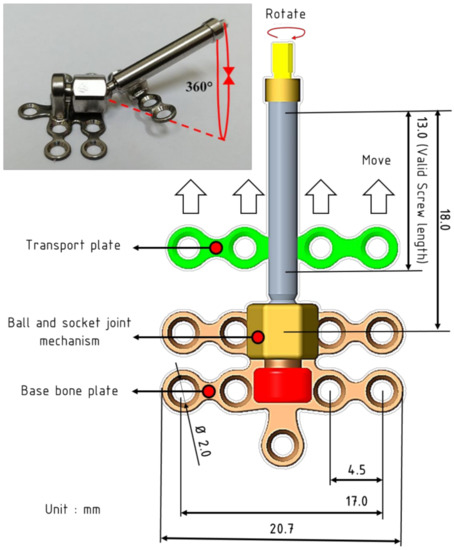 Accurate control of the possibility for multidimensional distraction in different directions is considered desirable for a novel alveolar distractor design [15,16,17,18]. A distractor designed with a ball and socket joint and the capability to control 3-dimensional movements during transport osteogenesis has been proposed in previous studies to achieve multi-axial distraction with various angle adjustments for alveolar ridge curve limitations, soft tissue pulls, inappropriate device positioning, or poor device trajectory [18,19,20]. Serious mechanical functional tests, including four-point bending resistance testing of the base bone plate, pull out testing of the multi-axial alveolar distractor, welding strength testing between the base bone plate and ball and socket joint mechanism and torque strength testing of the ball and socket joint, were approved to ensure the effectiveness and safety of our new multi-axial alveolar distractor [18].