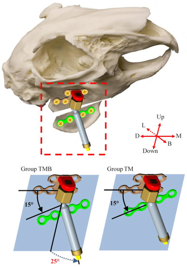 The distractor placement illustration defined that the multi-axial alveolar distractors were designed to fix at the right mandibular of the experimental rabbits. The distractor direction was adjusted 15° toward the mesial side and 25° to the buccal side in Group TMB (n = 3) and 15° toward the mesial side in Group TM (n = 3).