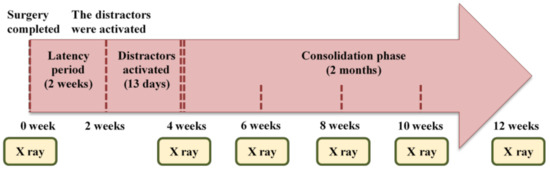 Figure 3 shows the experimental program diagram after surgery. The distractors were activated 1 mm/day for 13 days (13 mm in total length for distractor’s capability) after a 14-day latency period. The consolidation phase lasted 8 weeks (12 weeks after safe); a direct digital radiography (X-ray image) was taken every 2 weeks of the experimental rabbits to observe the growth of living bones in various periods. The shooting angle, distance and relative coordinate position between the camera and the experimental rabbit were maintained for each photographic shoot to ensure that all X-ray images had the same angle. The experimental rabbits were subsequently sacrificed. This study was approved by Affidavit of Approval of Animal Use Protocol, China Medical University, number: 2016-319.