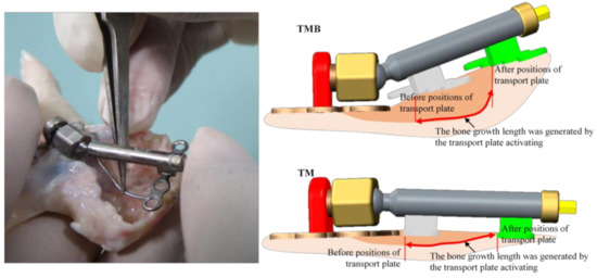 The rabbit cadaver observation results show that the average and standard bone growth length deviation in the corresponding bone positions before and after transport bone plate movement in Groups TMB and TM were 17.68 ± 1.51 mm and 14.79 ± 0.97 mm, respectively. The corresponding buccal side distraction thicknesses for Groups TMB and TM after distraction, were 5.12 ± 0.52 mm and 3.32 ± 0.37 mm, respectively. The mean bone growth length value and buccal side distraction thicknesses for Group TMB were significantly greater (p < 0.05) than that of Group TM (Figure 4 and Figure 5).