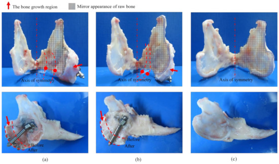 The growth bone shape corresponding to the distractor transport bone plate movement was measured, thereby calculating the traction stroke and bone growth amount of the alveolar bone retractor (Figure 4). The bone growth total length at the angulus region corresponding to the distractor transport bone plate movement before and after distraction was calculated by measuring the bending steel wire attached the growth bone surface. The variations in bone growth geometric shape observed in Groups TMB, TM and TC at the mandible angulus from the back and lateral views were also recorded (Figure 5). Buccal side angulus distraction thickness was quantified after distraction to compare the variations between Group TMB and TB. A statistical t-test was used to analyze the differences between groups.