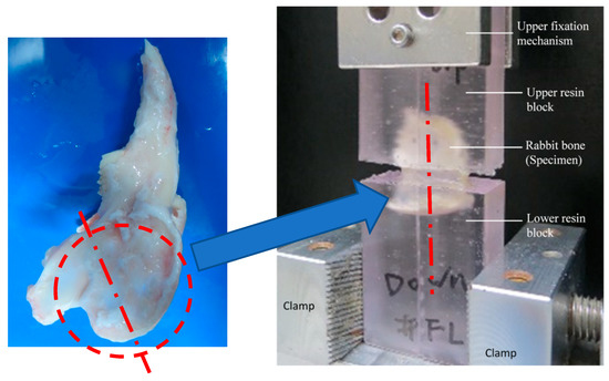 Right: the test specimen (mandibular bone after distraction and intact bone) was clamped and fixed to the materials test system to perform the fracture test. Left: the red circle shows the cutting area and the dotted line is the alignment line with the test machine axis.