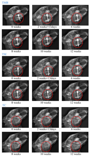 The digital radiography results showed that the osteotomy areas at the mandible angulus were healed and the bone growth was completed 4 weeks after surgery for all rabbits using multi-axial alveolar bone distractors (Figure 7). The TC group in Figure 7 shows the X-ray image tracking observation under the condition that this group did not use any multi-axial alveolar bone distractor.