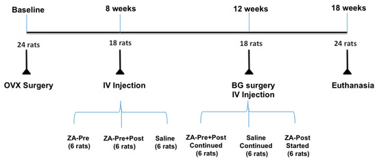 All animals were subjected to a bilateral ovariectomy procedure under general anesthesia (GA) to induce osteoporosis, which has been described and reported before [42]. As in Figure 1, the animals were divided and randomly distributed into four equal groups (n = 6 rats per group), according to the protocol for ZA administration, as following:
