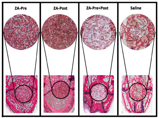 At the end of the study, six specimens of each experimental group were retrieved for histological preparation. Unfortunately, one of the specimens of the ZA Pre+Post group was lost due to problems with the embedding in pMMA (Table 1).