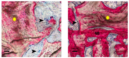 Representative histological images at high magnification showing bovine bone granules (yellow stars) well integrated into and completely covered by newly formed bone (NB) and osteoclast-like cells (black arrows). The left image represents the saline group, and the right image represents the ZA-post group.