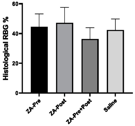 RBG% is considered e a measure for the osteoclastic activity and dimensional stability of a bone substitute material. RBG% values were 44.5 ± 8.8% for ZA-Pre, 47.1 ± 10.4% for ZA-Post, 36.3 ± 7.6% for ZA-Pre+Post, and 42.3 ± 7.5% for saline control group. No significant differences in RBG% existed between the various experimental groups (p > 0.5; Figure 5).