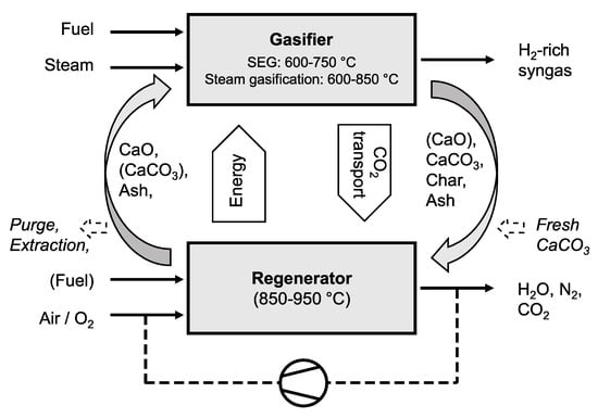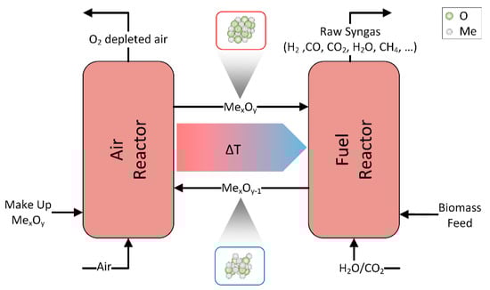 Figure 1. Schematic of the chemical looping gasification process. - The authors of the seventh paper, published by Almoslh, A.; Alobaid, F.; Heinze, C.; Epple, B., presented a combined experimental/numerical study on CO2 absorption []. Here, the effect of pressure on the gas/liquid interfacial area was investigated experimentally in the pressure range of 2 to 3 bar using an absorber tray column test rig, erected at the author’s institute. Furthermore, a rate-based model was generated based on the design data of the real test rig. A simulated waste gas, consisting of 30% carbon dioxide and 70% air, and distilled water as an absorbent were used in this work. Two gas flow rates were applied. The results predicted by the rate-based model agrees very well with the experimental data. At a higher inlet gas flow rate, the gas/liquid interfacial area was significantly decreased. A pressure increase leads to a decrease in the gas/liquid interfacial area and thus decreases the absorption rate of carbon dioxide.
