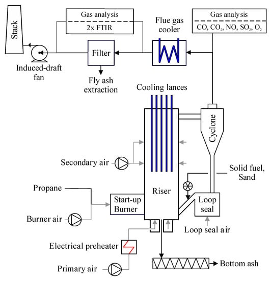 - Alobaid, F.; Peters, J.; Amro, R.; Epple, B. Dynamic process simulation for Polish lignite combustion in a 1 MWth circulating fluidized bed during load changes. Appl. Sci. 2020, 278, 115662. [Google Scholar] [CrossRef]