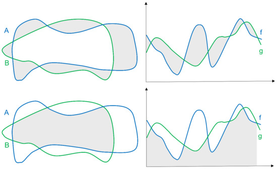 For better illustration, let us suppose two Lebesgue measurable sets . Let us imagine that these sets are described by non-negative real-valued functions in Cartesian system or (A corresponds to f and B corresponds to g) [15].