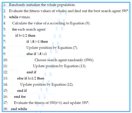 Remember that, according to Mirjalili and Lewis [], updating the WOA solutions is dependent upon different parameters such as c, G, E, and r3. The WOA optimization process terminates once the stopping criterion (i.e., minimum error or maximum iterations reached) is met and the best solution is obtained. Figure 1 displays the developed code of WOA.