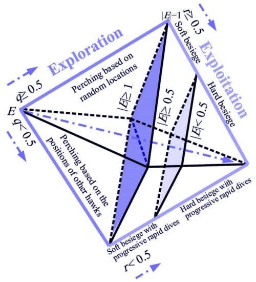 The co-operative hunting behavior of Harris’s hawks has been taken into consideration for the purpose of representing different issues for which optimum solutions are required [] in the Harris hawks optimization (HHO) algorithm [] proposed by Heidari et al. (2019). In this optimization process, four actions are represented: tracing, encircling, approaching, and attacking.