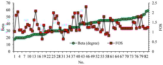 The current research was carried out assuming the circular critical failure of slopes. A database comprising 80 slope cases (formerly analyzed considering circular failure mode) was extracted from the existing literature [,,,,,,,]. Table 3 provides the datasets used in this study. Six key parameters were extracted, i.e., the unit weight of slope material (γ), cohesion (c) and angle of internal friction (ϕ), average angle of slope (β), shear strength parameter, pore water pressure coefficient (ru), and the slope height (H). Table 4 summarizes the slope stability database regarding the minimum (Min), average (Ave), maximum, standard deviation, and median values. This condition causes the slope stability analysis to be a problem of high complexity.