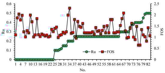 In statistical science, both the reliability and performance of models are required to be assessed in a quantitative way with the use of statistical indicators. For this purpose, in the current study, two statistical criteria were adopted, i.e., correlation coefficient (R2) and RMSE. R2 shows the difference between the estimated and actual FOS values, whereas RMSE represents the model’s error rate. They are computed as follows [,,,,,,,,,]: