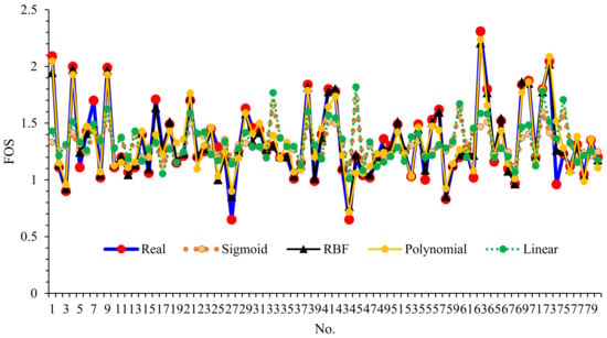 Table 5 provides the simulation results for four different SVR models. To achieve the best conditions of each model, parametric analysis was performed to determine the optimal parameters of each model. As can be seen, both polynomial and RBF models provide better conditions for FOS simulation. The RBF model with an accuracy of R2 = 0.947 shows that a more appropriate assessment can be made than other models to simulate the problem in this research. Figure 11 indicates the simulation results for four models. As can be seen, the data are simulated with higher accuracy by the RBF model. The model developed in this step is evaluated using optimization algorithms to determine the optimal conditions of the parameters used for FOS. Figure 12 shows the error changes of the models. Using this figure, the range of changes from prediction values to actual values can be obtained. As can be seen, the RBF model provides limited error variations. This indicates that for different samples, the predicted data are in the appropriate range and a good ability to perform them is observed.
