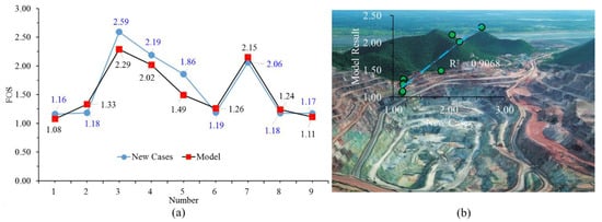 FOS results of new cases obtained by the developed radius basis function (RBF)-SVR model: (a) predicted v.s. measured, and (b) a view of L & K mine of Monyova copper mines.