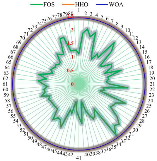 The RBF model is connected to two optimization algorithms, WOA and HHO, so that different parameters can be optimized. The two WOA and HHO models were implemented in MATLAB software. To examine their performance in solving various problems, four sample problems were used to find optimal locations. Figure 14 shows the comparison results between these models. As can be seen, the models have the ability to find the optimal locations. The goal is to find the optimal and sensitive conditions for FOS. Since each optimization algorithm has its own conditions, its parameters must also be determined for the optimal state. Therefore, numerical analysis was performed on the two optimization algorithms WOA and HHO to find their optimal coefficients. After determining the optimal coefficients, the algorithms use the basic RBF model to obtain the optimal conditions. Table 7 presents the optimal parameters determined based on the two WOA and HHO algorithms. As can be seen, the optimization algorithms can each offer different optimal conditions that can be used depending on the different conditions. The solution of the algorithms shows that each goes to the optimal state and ultimately leads to the desired results. In general, it can be inferred from the results that using optimization methodology, more efficient designs can be done for engineering and sensitive projects.