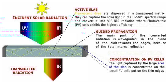 The hypothesis of converting the incident solar spectrum into monochromatic light in the LSCs was already proposed at the end of the 1970s, when LSCs based on organic dyes were first introduced as a low-cost technology to enhance the power conversion efficiency (PCE) of PV solar cells through improving their spectral response [1]. They can collect both diffuse and direct solar radiation, making them a suitable technology to be used in countries where diffuse solar radiation is dominant (more than 50%) such as in northern European countries [2]. Unlike traditional PV panels, LSCs are transparent and can be made with a wide variety of colors and shapes. Thanks to these characteristics, LSCs can be seen as potential structural energy components in the design of PV windows, skylights, and colored PV panels in building facades, but also of noise barriers, advertisement signs, shelters, agricultural covers, and so on, reducing environmental pollution caused by fossil fuels.