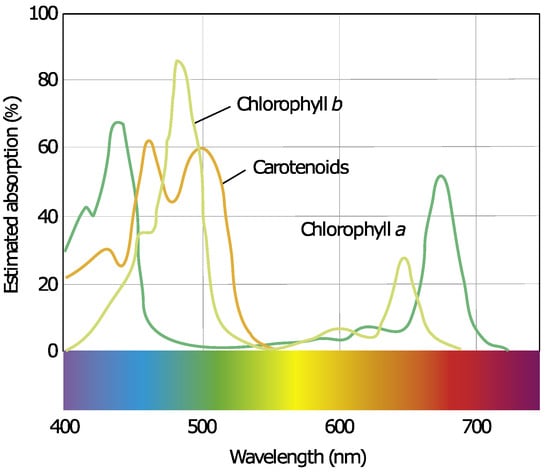 The chlorophyll exists in two forms: chlorophyll a and chlorophyll b. Chlorophyll a shows a strong light absorption in the blue zone of the solar spectrum as well in the red zone; chlorophyll b absorbs mostly blue and orange light. In contrast, both absorb poorly the green and near-green light, which reflects the typical green color of the leaves. In the near-green zone, the absorption of carotenoids takes place (Figure 2).