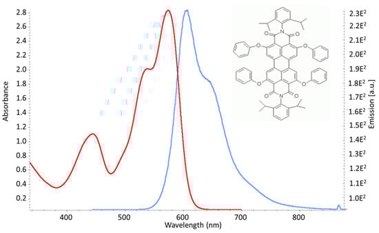 Absorption (red curve) and photoluminescent emission (blue curve) spectra of Lumogen F305.
