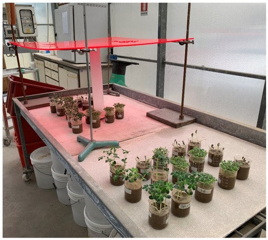 The microcosm tests were carried out in two different conditions: inside a greenhouse (first phase) and outdoor (second phase). In the first phase (Figure 4), the plants were grown on a microcosm scale under a red LSC panel of 100 × 100 cm supplied by Eni, positioned at the height of about 50 cm to allow adequate plant growth. As a comparison, the same tests were set up outside the LSC panel. The first phase aimed to evaluate if the red LSC panel could hinder or reduce the biomass production of the selected species.