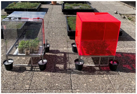 Picture of outdoor experiments. The boxes are made of transparent polycarbonate and red LSC panels. Note: pots filled with white stones at the base of the box structures have the only function of anchoring the panels to avoid possible adverse effects in the event of a mighty wind.