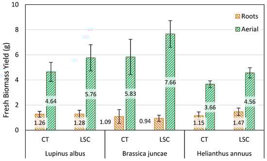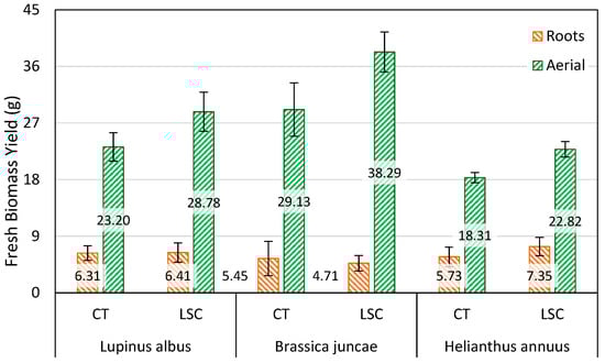 The first phase aimed to evaluate if the red LSC panel could hinder or reduce the biomass production of the selected species. The obtained results for the fresh weight for the aerial part and roots are reported in Figure 6. In the following, B LSC, H LSC, and L LSC indicate the brassica, sunflower and lupine plants grown under the LSC panel. B, H, and L refer to species grown outside the LSC panel, also indicated with the label CT (control).