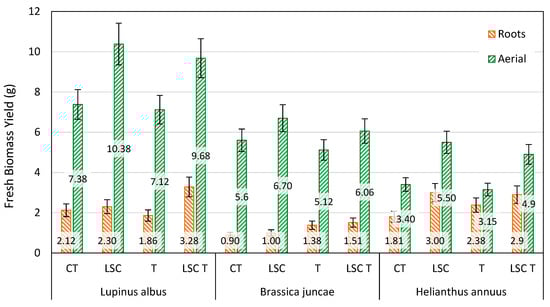 Fresh biomass yield (g) for aerial part and roots. Values are reported as mean ± standard deviation.