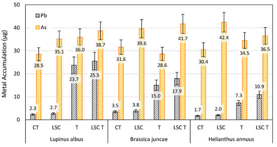 The total accumulation of the two metals for the three investigated plants is reported in Figure 11 for As and Pb.