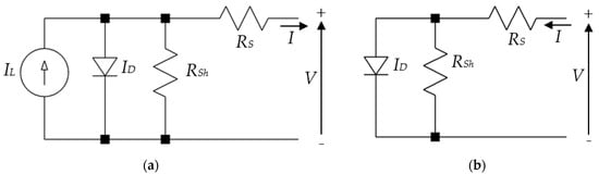 Solar PV cells convert sunlight into electricity. All potential combinations of current and voltage pairs of points of the PV device under certain conditions of irradiance and temperature are represented in an I-V curve. There are different models that describe the electrical behavior of the I-V curve of a PV device. The one exponential model is widely used and it includes the series and shunt resistances, as detailed in the following Equation (1) [,]. Figure 1 shows the equivalent circuit of the one-diode model of a PV cell under illumination conditions (a) and dark conditions (b).