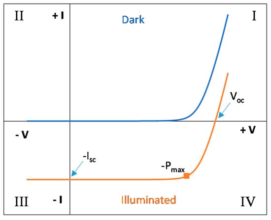 In Equation (1), IL is the photogenerated current, I0 is the saturation current of the diode, n is the diode ideality factor, Rs is the series resistance, Rsh is the shunt resistance, and vt is the thermal voltage (K T/e) with k as the Boltzmann constant, e as the electron charge, and T as the temperature in Kelvin. In the dark conditions model circuit, as the photogenerated current IL due to illumination is zero, the current generator is missing. In Figure 2, there is a common I-V curve under illumination represented in the fourth quadrant, which overlaps the dark diode current with the photogenerated current due to illumination and the dark I-V curve in the first quadrant. The main characteristic points of the curve in illumination are marked in this figure. The criteria that have been considered in this research are that the current is negative when the PV device is generating power (fourth quadrant).