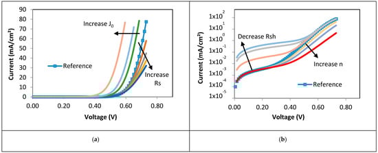 Simulated dark I-V curves by introducing changes in one of the exponential parameters. Reference curve: J0 = 1.5 × 10−9 A/cm2, n = 1.5, Rs = 0.6 Ω cm2, and Rsh = 60.000 Ω cm2, (a) increase in Rs from 0.6 to 2.5 Ω cm2 and J0 from 1.5 × 10−9 to 5 × 10−8 A/cm2; (b) increase in n from 1.5 to 1.9 and decrease in Rsh from 60,000 to 500 Ω cm2. Graph (b) is presented in logarithm scale.
